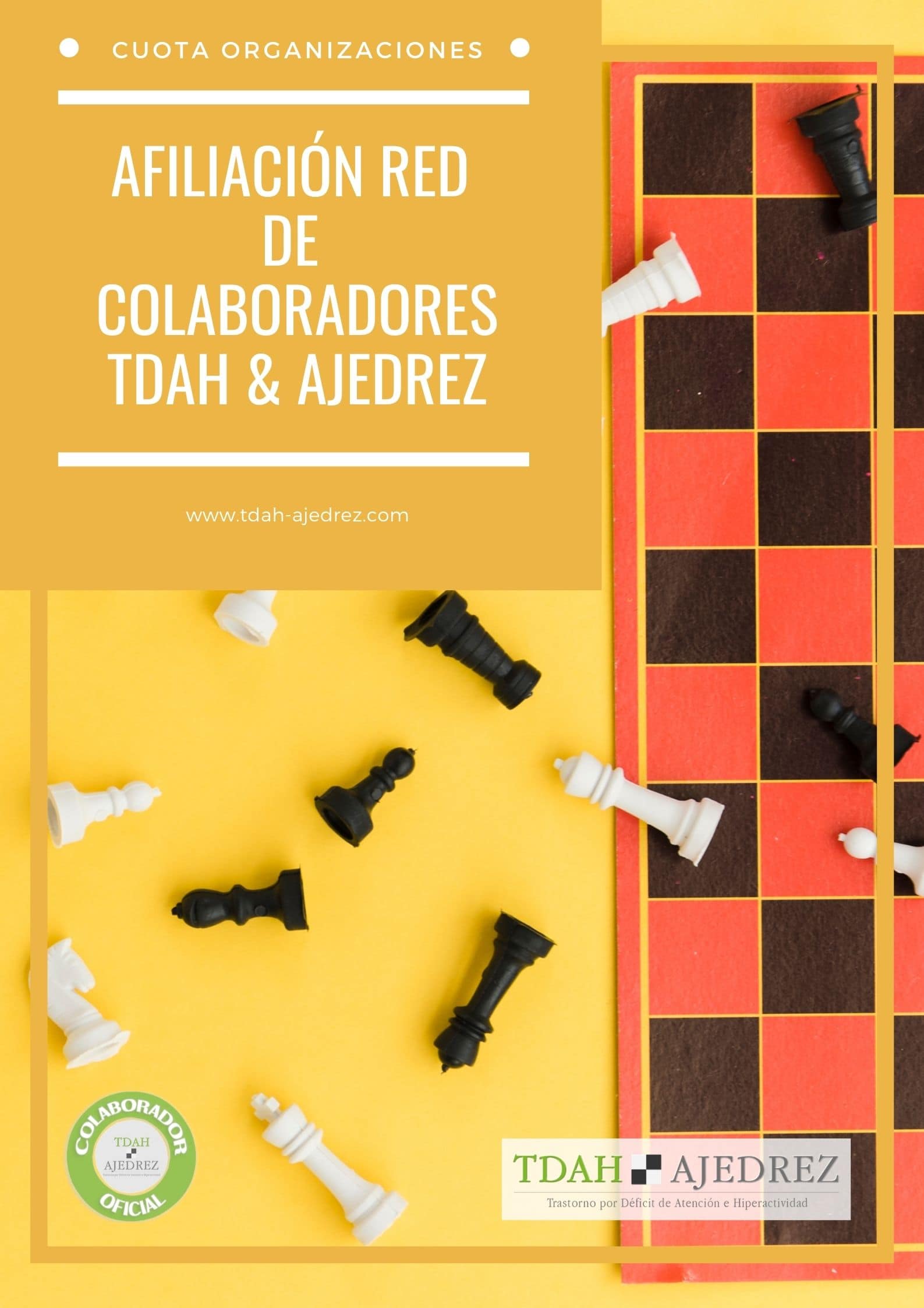 La cuota de afiliación a la Red de Colaboradores de TDAH & Ajedrez, supone la pertenencia a una red de trabajo, de ámbito mundial, formada por profesionales especializados en diferentes áreas, específicamente relacionadas con el tratamiento de personas diagnosticadas con TDAH: psicología, neurodesarrollo, educadores y docentes, psiquiatría, especialistas en coordinación motora y fisioterapia, psicopedagogos, músicos, ajedrecistas y, en definitiva, profesionales de todos los sectores que pueden aportar su valioso conocimiento al tratamiento de personas con TDAH y otras dificultades de aprendizaje, ya sean niños o adultos.